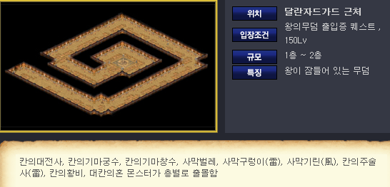 - 위치: 몽골 달란자드가드 근처 - 조건: 왕의무덤 출입증 퀘스트 + 레벨 150 이상 - 규모: 1층 ~ 5층 - 특징: 아시아를 정복했던 몽골 제왕이 잠들어 있는 무덤 |