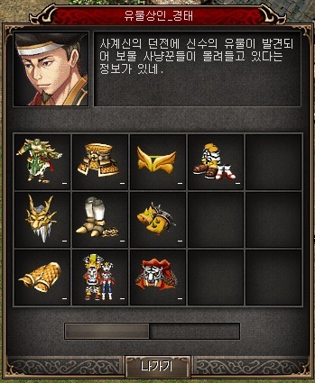 청룡의(Lv.215)(계정귀속) : 고대신수의정수200개, 1억냥 청룡투(Lv.215)(계정귀속) : 고대신수의정수150개, 1억냥 청룡손목보호대(Lv.200) : 청룡의정수(거래불가) 150개, 2천냥 청룡의요대(Lv.200) : 청룡의정수(거래불가) 200개, 2천냥 청룡의신발(Lv.200) : 청룡의정수(거래불가_) 175개, 2천냥 백호피갑(계정귀속)(Lv.215) : 고대신수의정수 200개, 1억냥 백호머리띠(계정귀속)(Lv.215) : 고대신수의정수 150개, 1억냥 백호손목보호대(Lv.200) : 백호의정수(거래불가) 150개, 2천냥 백호의요대(Lv.200) : 백호의정수(거래불가) 200개, 2천냥 백호의전투화(Lv.200) : 백호의정수(거래불가) 175개, 2천냥 |