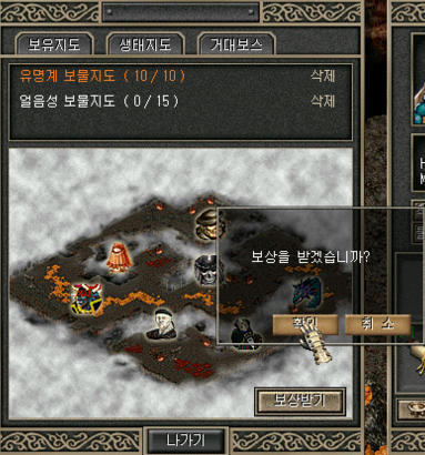 : ㅁㅁ지도조각(거래불가)을 전부 채워서 보물지도를 완성한 경우. : "보상받기"를 클릭하면 보상 아이템이 주막으로 지급 |