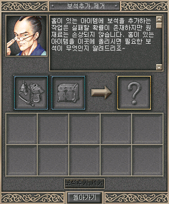 교환·획득·강화 - 보석추가,제거 작성시간19.01.23|조회수1,178 목록 댓글 0 글자크기 작게가 글자크기 크게가 ■ 보석추가,제거- 대장장이_왕쵸(NPC)가 주술 아이템의 '홈제조'를 할 수 있다.- 홈이있는 주술아이템에 보석을 추가,제거할 수 있다.위치① 일본 후쿠오카 마을 6시방향.② 세공사_우라마시(NPC)재료- 홈이있는 주술 아이템 + 보석- 확률적으로 성공한다.- 실패시 장비는 손실되지 않으나, 보석과 수수료는 손실된다. 다음검색 현재 게시글 추가 기능 열기 북마크 신고 센터로 신고 댓글 댓글 0 댓글쓰기 답글쓰기 댓글 리스트