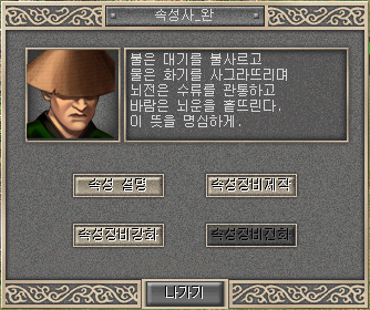* 2세트효과: 타격저항 +5% * 각 용병은 자신의 속성에 맞는 장신구 아이템만 착용 가능. * 속성의가루 10개 : 봉황의깃털 1개 + 각종 작은 속성석 1개씩+100만냥. | ||