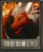 어린화룡(火) | 등급 : 최상급 생명력: 3750 지력 : 500 타격저항: ?? % 마법저항: ?? % |