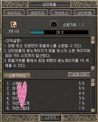 : 상단토벌 탭(단축키 H)에서 관련정보 확인. 상단토벌 탭에서 대방, 도방만 토벌보스 소환 가능. |
