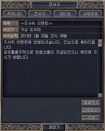 : 보상 아이템 획득시, 전서구가 온다. : - 두이갑옷(거래불가) 1개 -두이투구(거래불가) 1개 -일취월장-30일(거래불가) 1개 -경험치 두루마리(백만)(거래불가) 10개 |