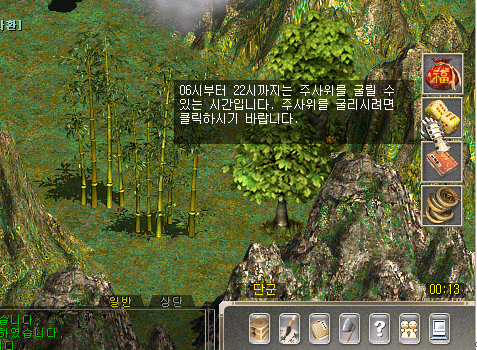 - 시간제한: 06시 ~ 22시 사이에 참가 할 수 있음. - 소모비용: 1000냥 - 참가방법: 화면 우측하단의 주사위 버튼을 누르면 된다. |
