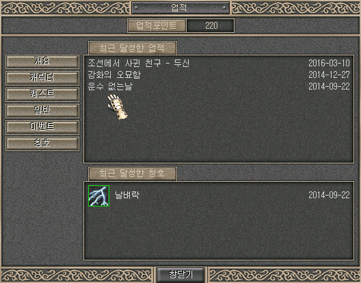 - 업적으로 등록된 내역들은 캐릭터, 퀘스트, 일반 등으로 분류되어 있음.