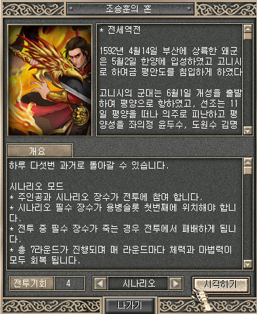 [시나리오] - □□□의 혼 NPC 를 통해 해당 장수의 과거로 갈 수 있음. - 이용 횟수는 하루 5회로 제한. - 주인공의 국적과 상관없이 이용 가능. - 주인공 + 해당 필수 장수만 참여 가능. - 해당 필수 장수는 용병슬롯 첫번째 칸에 위치해야 함. - 둘 중 하나라도 사망하면 패배처리. - 총 7 라운드 진행함. [일반]ㅡ'시나리오'완료 이후에 '일반' 가능. - □□□의 혼 NPC 를 통해 해당 장수의 과거로 갈 수 있음. - 이용 횟수는 하루 5회로 제한. - 주인공의 국적과 상관없이 이용 가능. - 주인공 포함 총 5명 입장 - 용병슬롯 첫번째~네번째 칸에 위치해야 함. - 총 7 라운드 진행함. - 난이도가 증가시, 몬스터의 능력치와 아이템 획득 기회증가. (쉬움, 보통, 어려움) ※ 시나리오, 일반, 개조, 각성 모두 합해서 횟수 5회 제한임. |