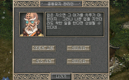 [장비강화] - NPC '공동묘지 관리자' 가 장비 강화 임무를 수행. - 장비를 강화. - 일반/전용의 무기ㆍ방어구를 (+1)~(+5)로 강화. - 진화된 아이템의 강화 성공확률은 50%. - 장비강화시 '시간의가루'가 소모. - [예시] 비호투구 → 비호투구(+1) [장비진화] - NPC '공동묘지 관리자' 가 장비 진화 수행. - 각성 2차장수 무기ㆍ방어구 제조. - 장비진화시 '시간의가루'가 소모. - 장비진화 완료된 전용 아이템은 세트효과가 붙음. - [예시] 고급대력궁(+5) → 시호충장의대력궁 |