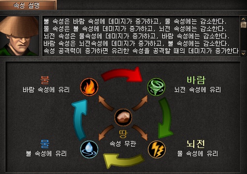 - 불 속성은 바람 속성에 강함. 바람 속성은 뇌전 속성에 강함.