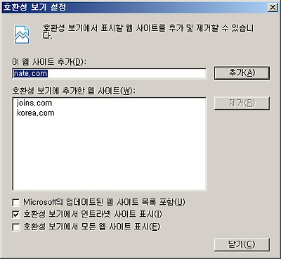 IE8과 호환되지 않는 웹 사이트는 호환성 보기 설정을 통해 추가할 수 있어