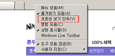 호환성 보기 버튼을 추가하기 위해서는 상단 탭에 오른쪽 버튼을 클릭하고 ‘호환성 보기 단추’를 선택하면, 익스플로어 주소창과 새로고침 버튼 사이에 호환성 보기 버튼이 자동 추가된다.