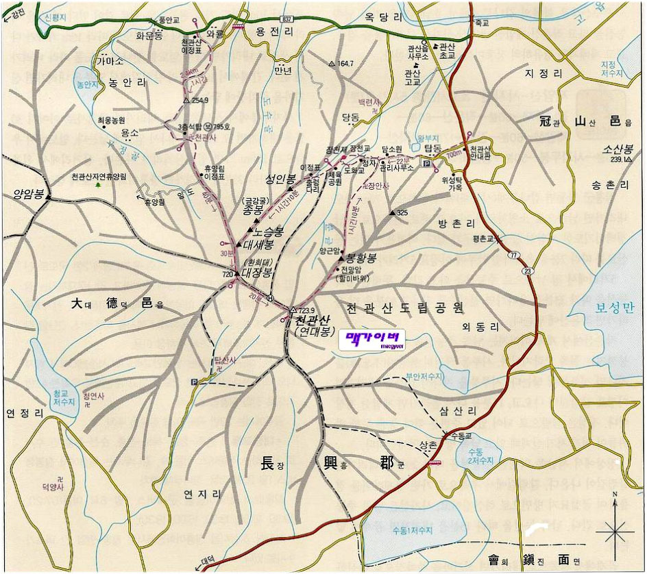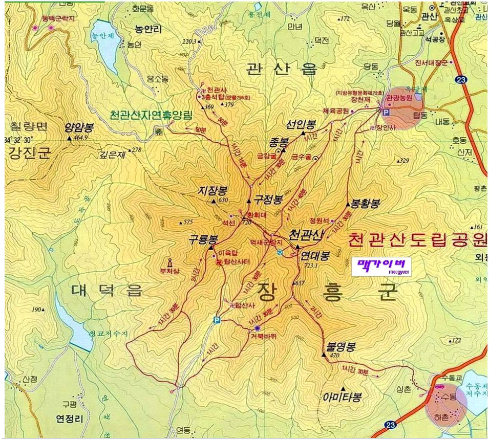 천관산 탐방 안내도에는 3가지 길의 원점회귀 등산코스가 있다.