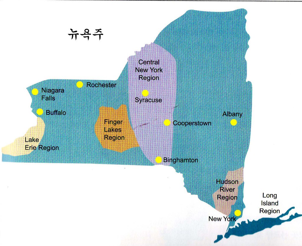 뉴욕의 와인 생산지는 4개로 나뉜다. 허드슨강 계곡, 핑거레이크 지역, 이리호 지역, 그리고 롱아일랜드이다. 이 중에서 허드슨강 계곡은 가장 오래전에 와인 양조를 시작한 곳이고, 롱아일랜드 지역은 가장 최근에 발달된 지역이다. 또, 핑거레이크지역은 가장 많은 와인 양조장이 있고 가장 빨리 확장되고 있는 지역이다.