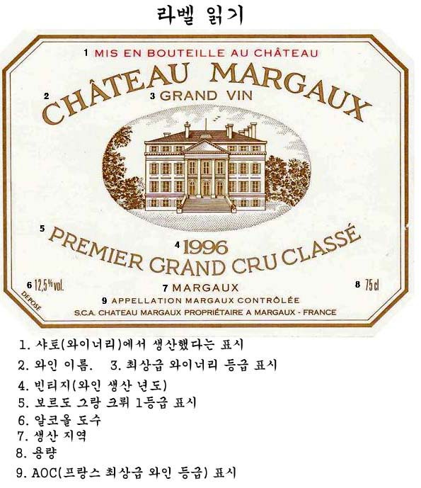 4) 그 외, 알코올 도수, 와인병에 담겨져 있는 용량, 생산국가, 병입 장소 오크통 또는 탱크에 담겨 있던 와인을 병에 담은 장소를 뜻한다)가 쓰여 있다.
