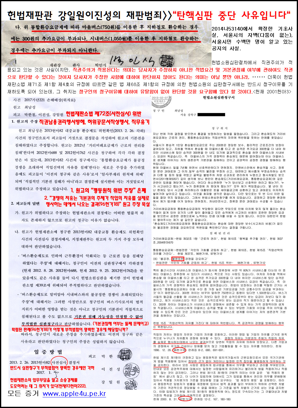 원고가 이정미 헌재소장에게 피고들이 조직적이고 의도적으로 저지른 심판범죄와 헌법과 법률위반에 관하여 내용증명우편으로 다섯 차례 알려 주었습니다. 즉 원고가 제시한 증거로써 범죄 사실을 사료하기에 전혀 모자람이 없습니다. 그렇다면 이정미 헌재소장은 원고가 요구하는