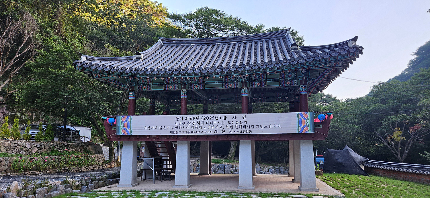 강천사에서 안녕히 잘 다녀가시라는현수막~