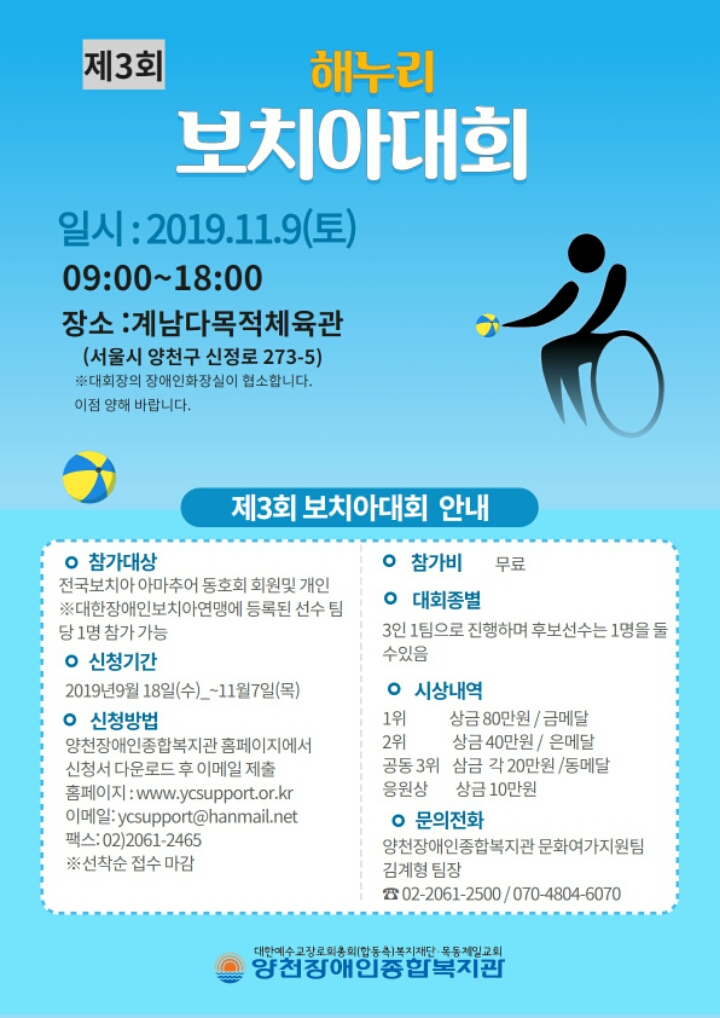 제3회 해누리보치아대회 작성자김석원(관악보치아)|작성시간19.09.18|조회수398 목록 댓글 0 글자크기 작게가 글자크기 크게가 제3회 해누리보치아대회 첨부파일첨부된 파일이 2개 있습니다. jpg 파일 resized_20190918_232454_-782220738.jpg 다운로드 hwp 파일 제3회_해누리보치아_대회_요강_및_신청서.hwp 다운로드 다음검색 현재 게시글 추가 기능 열기 북마크 공유하기 신고 센터로 신고 댓글 댓글 0 댓글쓰기 답글쓰기 댓글 리스트