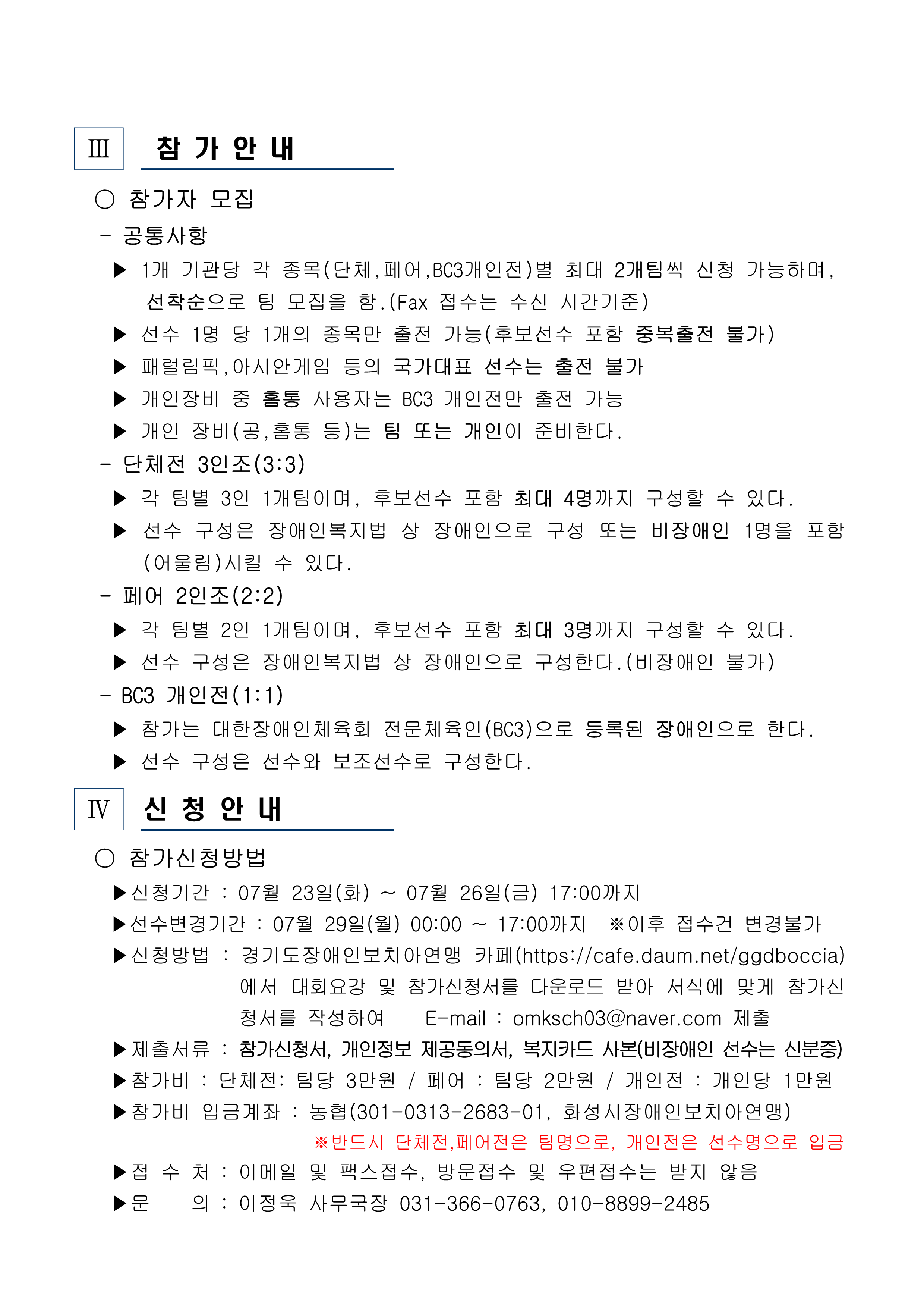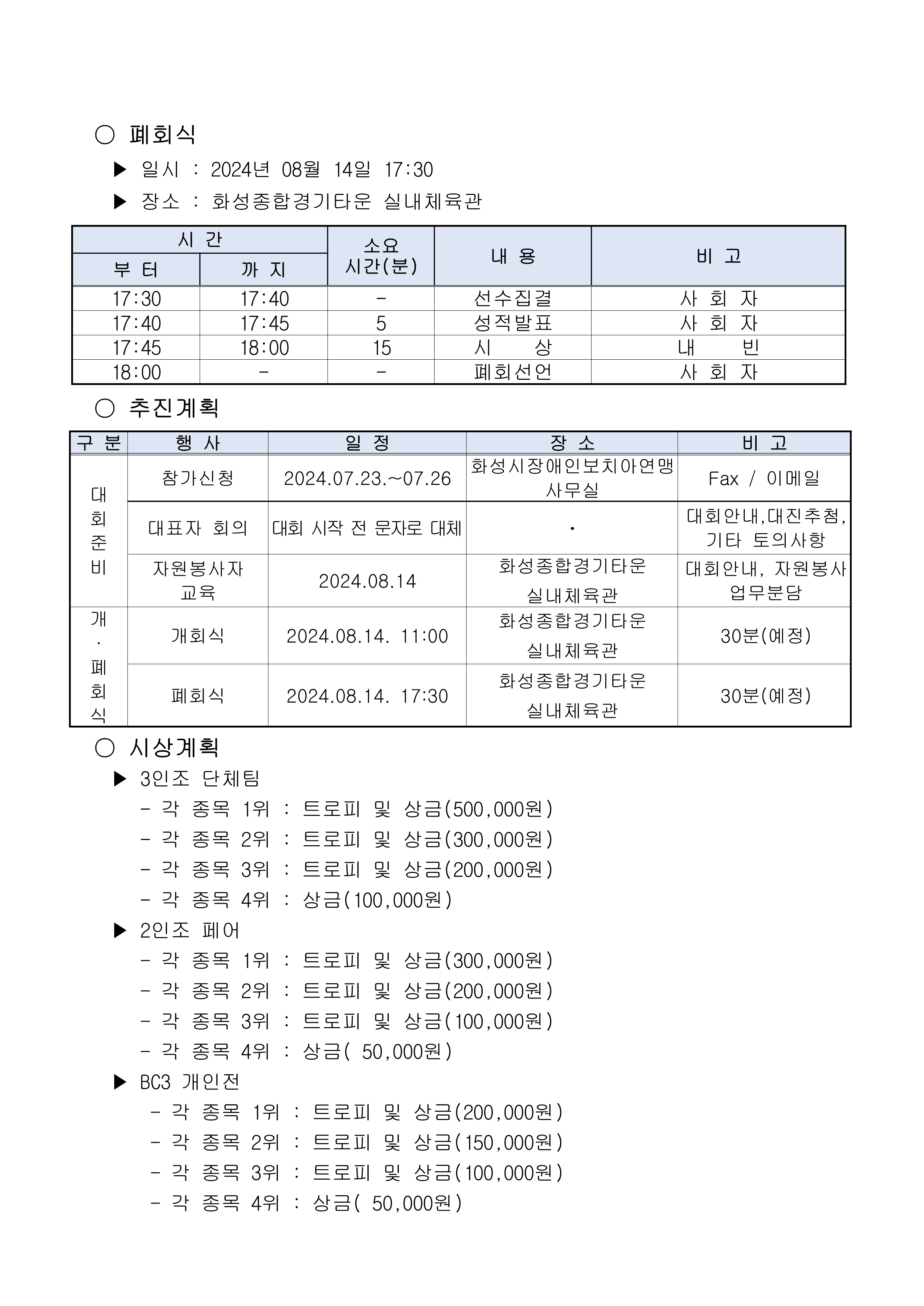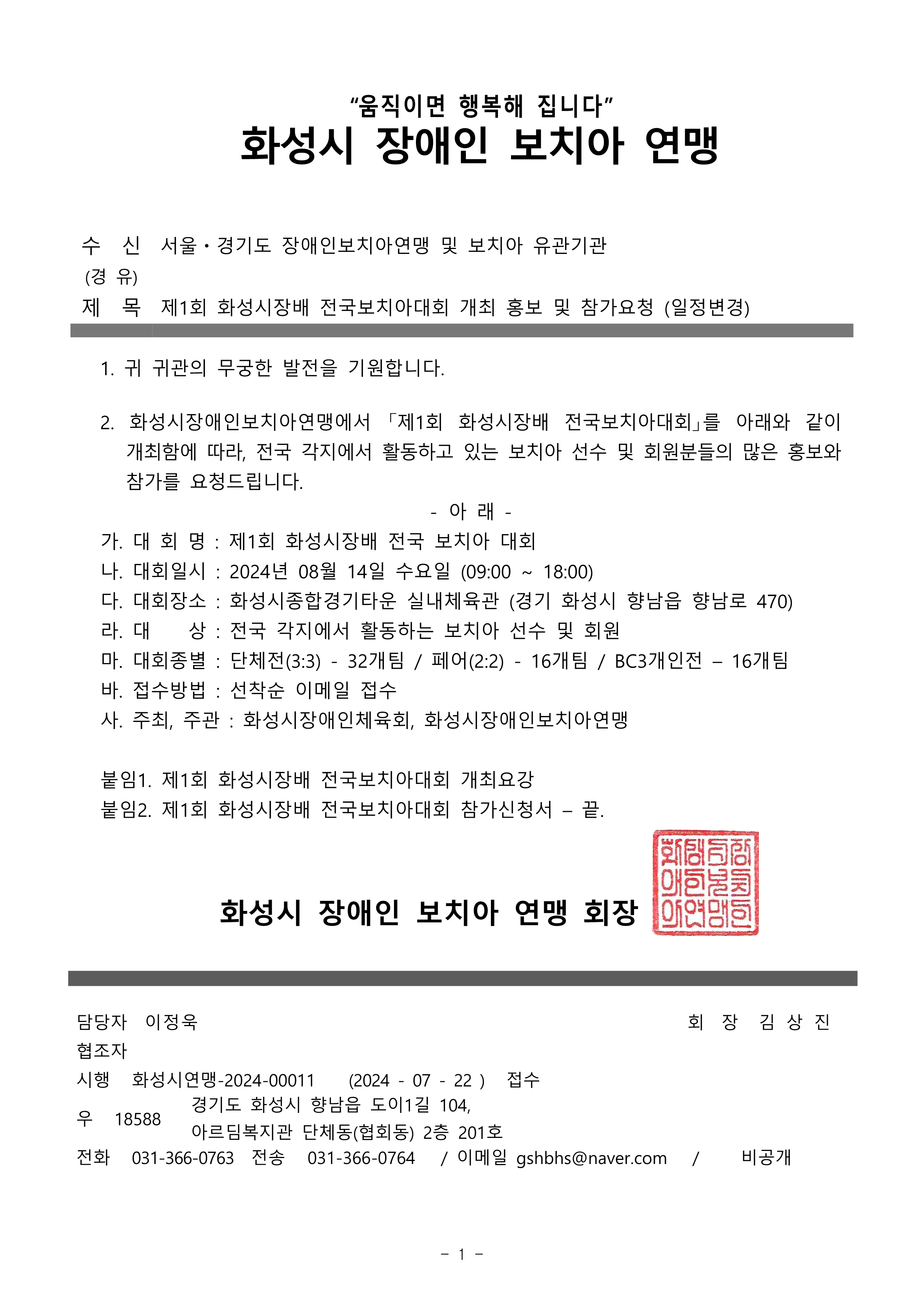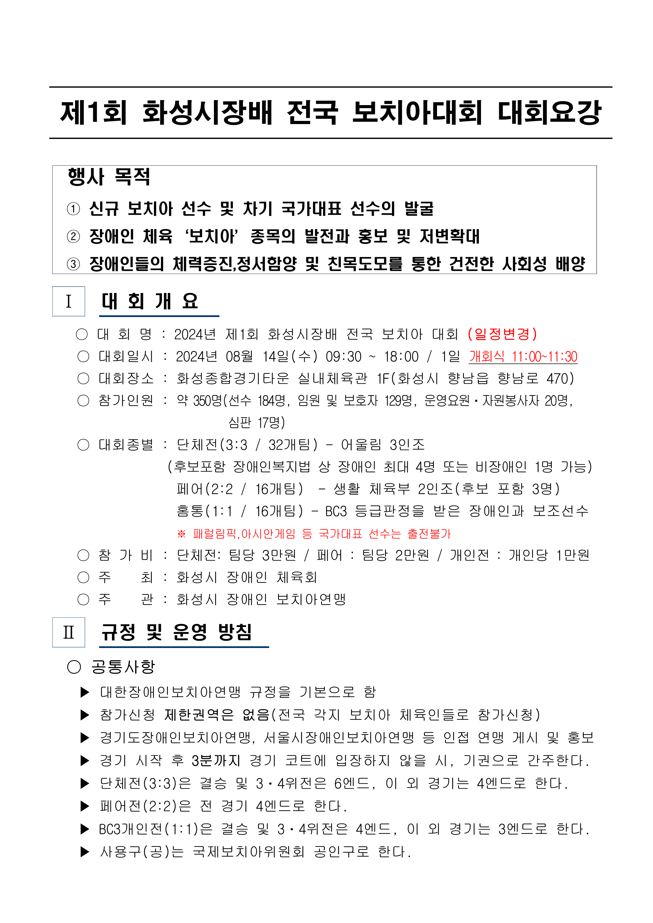 지난 7월3일 개최 예정이었던 '제1회 화성시장배 전국보치아대회'가 화성에서 발생한 화재로 인해 연기되어, 오는 8월 14일 개최하기로 확정되었습니다.