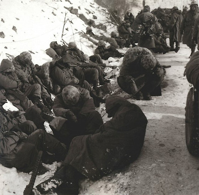 사진은 중국군의 참전으로 후퇴중인 유엔군 병사들이 강추위속에 휴식을 취하고 있다.1950.12.6 /연합뉴스