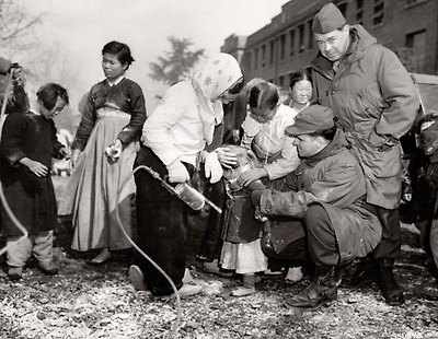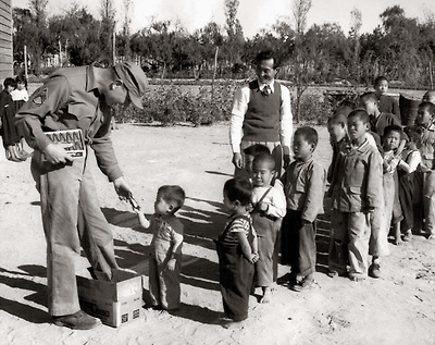1951년 2월16일 미군들이 주민들의 협조를 받아 어린이들에게 DDT 살충제를 살포하는 모습