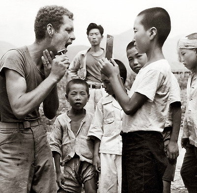 1950년 8월22일 면도중인 미군 병사와 거울을 들고 있는 어린이의 모습