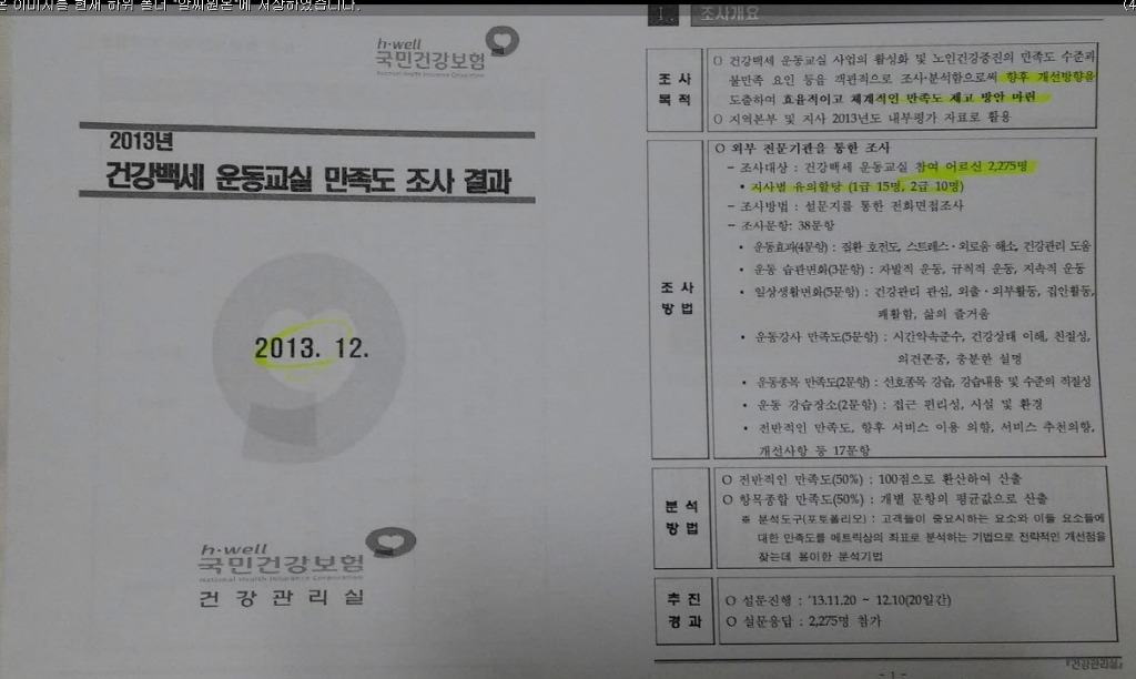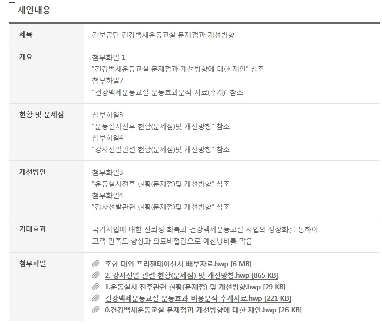 퇴직후 고령화시대에 노인 의료비 절감을 주요사업중 하나로 지금의 ‘건강나눔사회적협동조합’을 만들었고 재직시 공단의 운영방식에 대해서도 끊임없이 개선을 요구해왔지만 지금까지 개선되지 않는 문제점에 대해 건강백세운동교실 사업의 성공을 위한 개선방향에 대해 붙임과 같이 제안합니다.