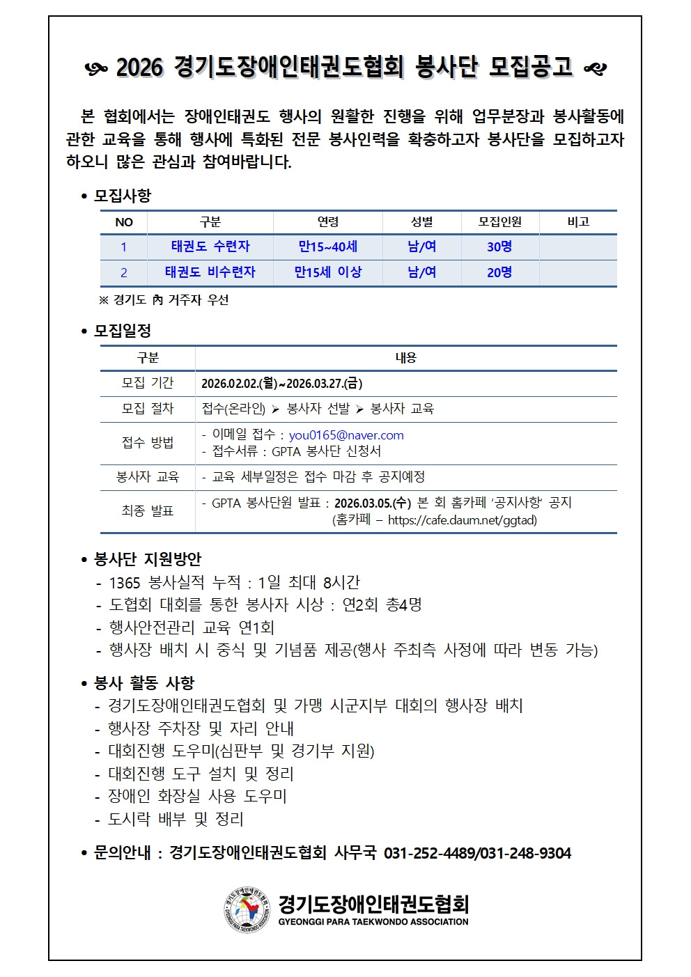 2026 경기도장애인태권도협회 봉사단 모집공고 작성자사무국장|작성시간26.01.23|조회수93 목록 댓글 0 글자크기 작게가 글자크기 크게가 (서식)GPTA 봉사단 가입신청서.hwp208.00KB 첨부파일첨부된 파일이 2개 있습니다. hwp 파일 (서식)GPTA 봉사단 가입신청서.hwp 다운로드 jpg 파일 (모집공고) 2026 GPTA봉사단.jpg 다운로드 다음검색 현재 게시글 추가 기능 열기 북마크 공유하기 신고 센터로 신고 댓글 댓글 0 댓글쓰기 답글쓰기 댓글 리스트