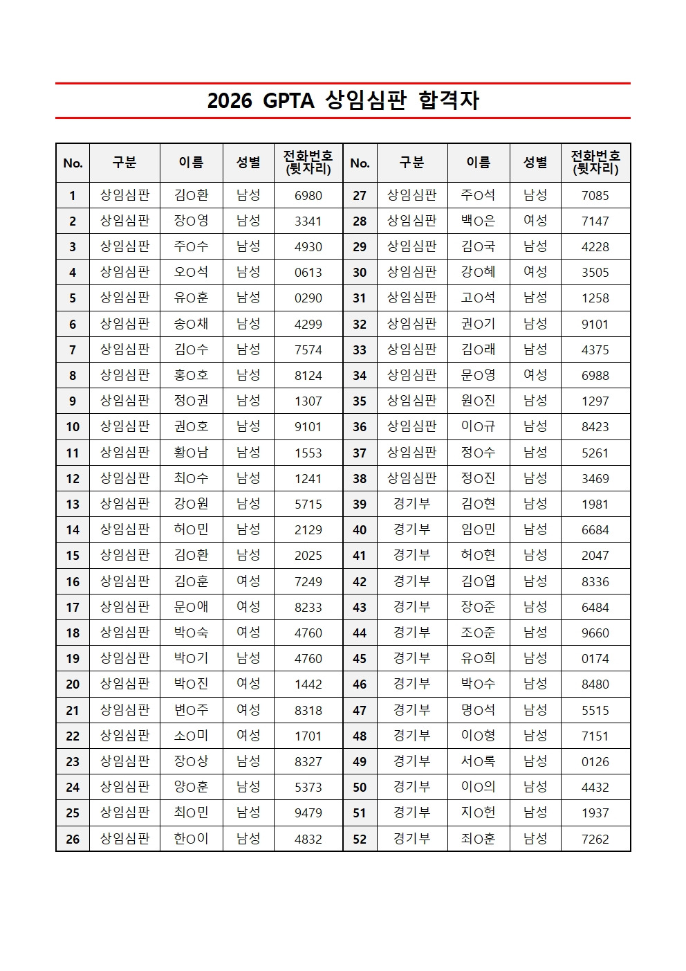 2026 GPTA 상임심판 합격자 명단 작성자사무국장|작성시간26.01.28|조회수85 목록 댓글 0 글자크기 작게가 글자크기 크게가 다음검색 현재 게시글 추가 기능 열기 북마크 공유하기 신고 센터로 신고 댓글 댓글 0 댓글쓰기 답글쓰기 댓글 리스트