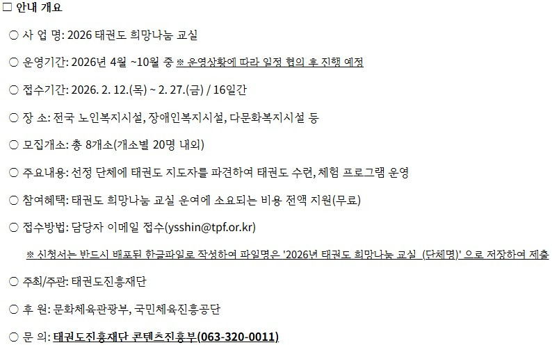 2026 태권도 희망나눔 교실 참가모집 안내 작성자사무국장|작성시간26.02.19|조회수38 목록 댓글 0 글자크기 작게가 글자크기 크게가 2026년도 태권도 희망나눔 교실 참여단체 모집 공고문.hwp127.00KB(제출서류 양식) 2026년도 태권도 희망나눔 교실.hwp66.00KB 첨부파일첨부된 파일이 3개 있습니다. jpg 파일 화면 캡처 2026-02-19 090957.jpg 다운로드 hwp 파일 2026년도 태권도 희망나눔 교실 참여단체 모집 공고문.hwp 다운로드 hwp 파일 (제출서류 양식) 2026년도 태권도 희망나눔 교실.hwp 다운로드 다음검색 현재 게시글 추가 기능 열기 북마크 공유하기 신고 센터로 신고 댓글 댓글 0 댓글쓰기 답글쓰기 댓글 리스트