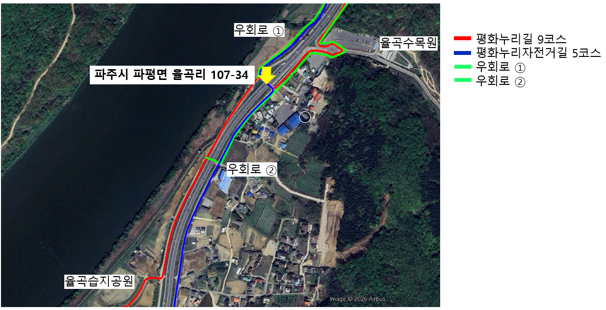 도보길 9코스, 자전거길 5코스 노선 내 강변살자 카페 ↔ 율곡수목원 방향으로 관통하는 굴다리 앞쪽에 공사 중이라 3월 말까지 이용이 어렵다고 합니다.