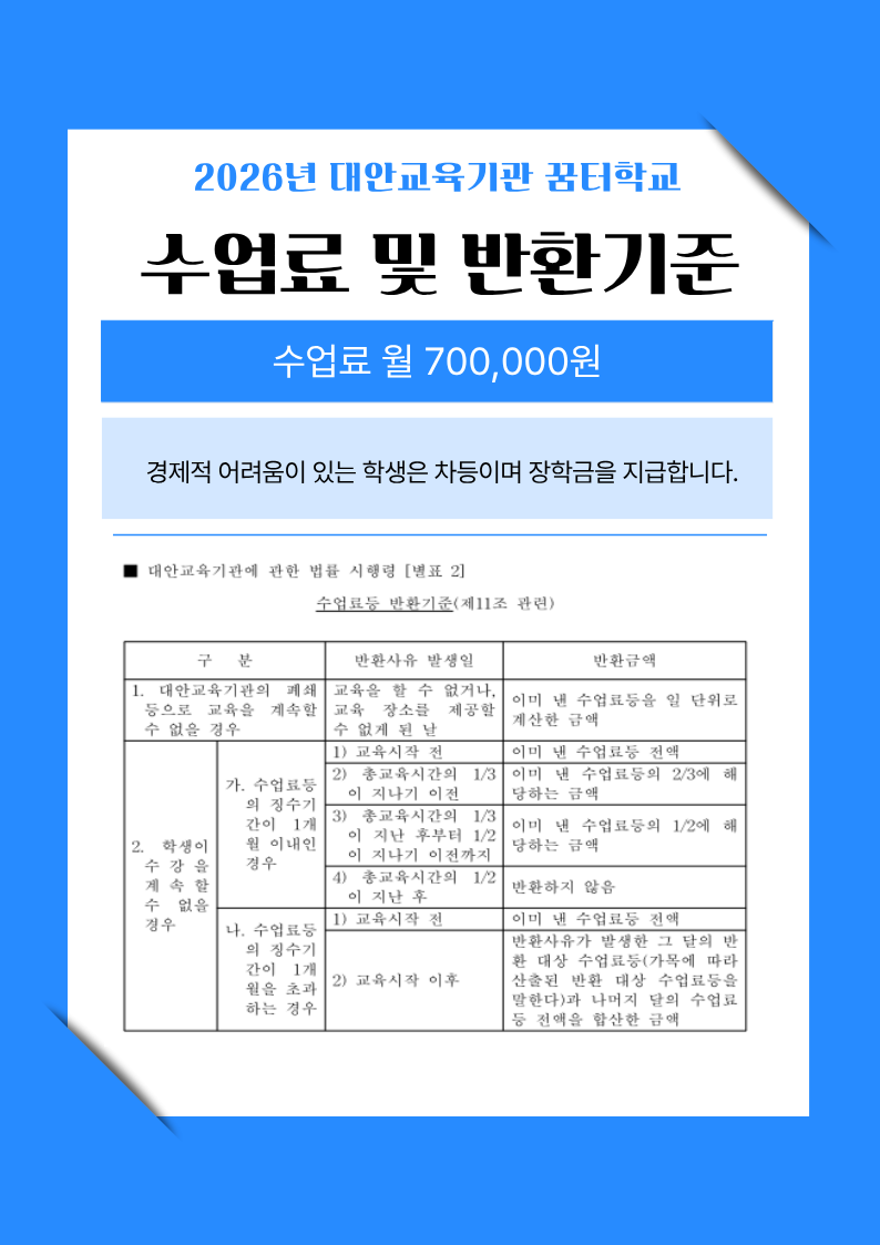 2026학년도 수업료 및 반환기준 안내 작성자peppermint|작성시간26.01.27|조회수147 목록 댓글 0 글자크기 작게가 글자크기 크게가 다음검색 현재 게시글 추가 기능 열기 북마크 신고 센터로 신고 댓글 댓글 0 댓글쓰기 답글쓰기 댓글 리스트