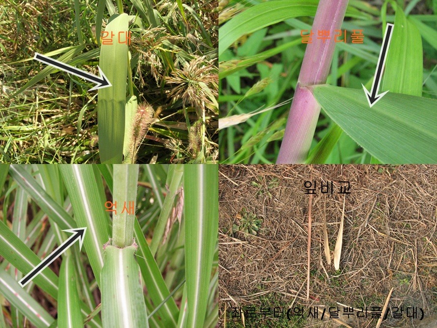 꼭 그렇지는 않지만 달뿌리풀은 일반적으로 줄기에 자주색이 많아 갈대,억새와 구분이 됩니다.