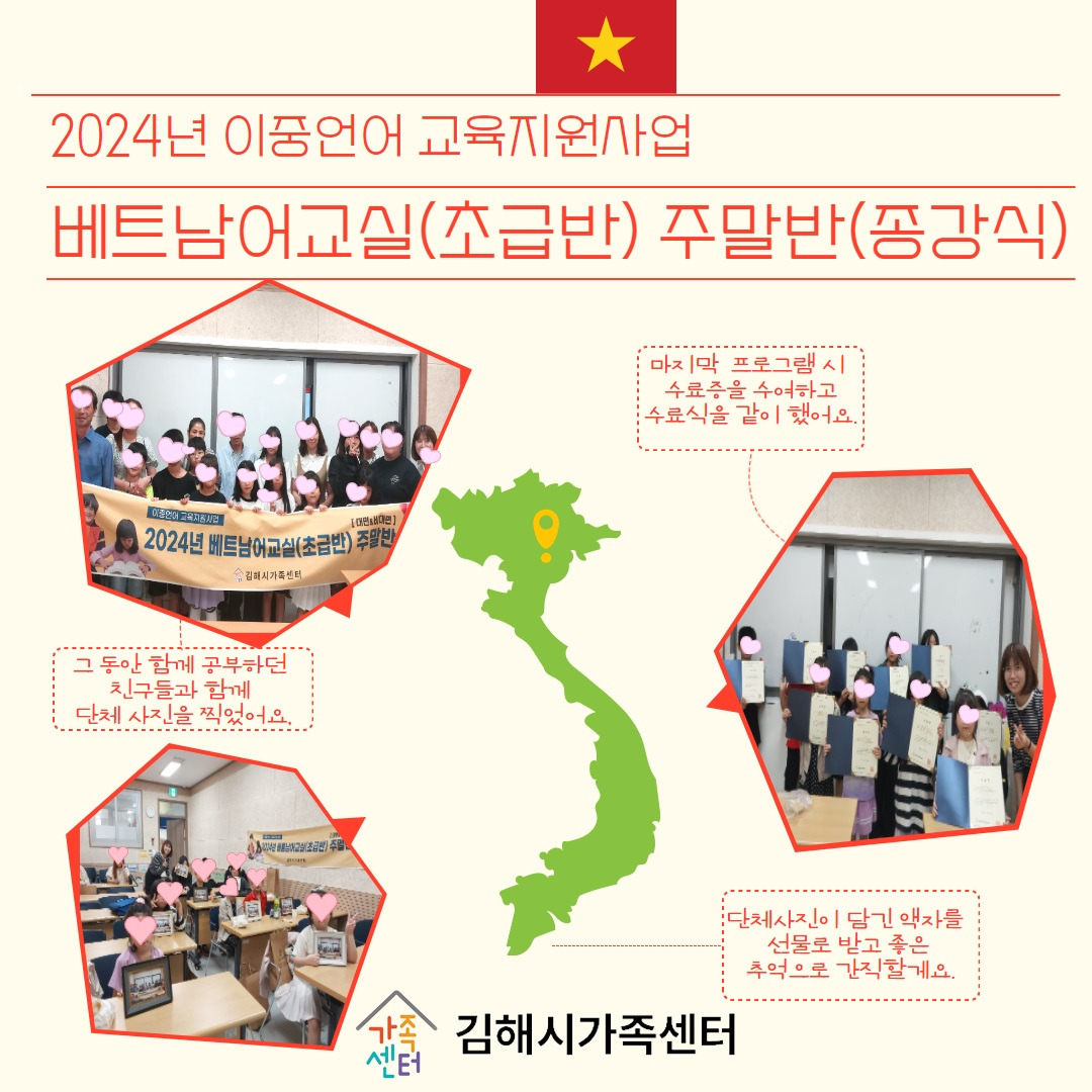 안녕하십니까? 김해시가족센터 이중언어 교육지원사업 담당자 설서나입니다. 올해 이중언어 교육지원사업의 일환으로 "베트남어교실(초급반) 주말반"을 운영하였습니다. 베트남어교실(초급반) 주말반의 경우, 3월 23일부터 개강하였고 5월 4일, 8월 3일을 제외하여 매주 토요일 10:00~12:20 총 27회기/80차시를 진행하였습니다. 올해 16명의 자녀들이 참여하였습니다. 종강 전 자녀들과 가족분, 이중언어강사분과 함께 단체사진을 촬영하였습니다. 종강시 수료식을 진행하였고 자녀들에게 추억이 담긴 액자를 선물을 했습니다. 그 동안 열심히 참여하신 가족분들께 대단히 감사드립니다^^