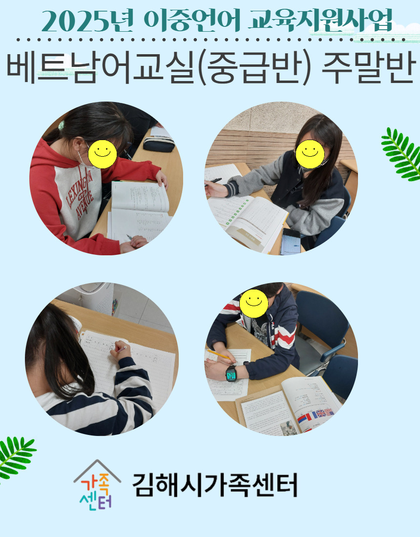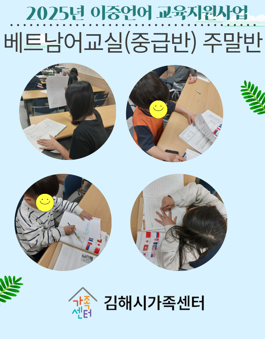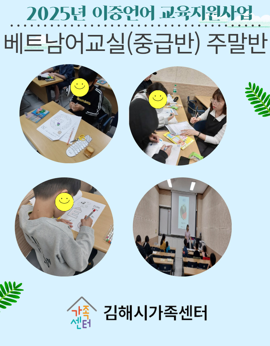 안녕하십니까? 김해시가족센터 이중언어 교육지원사업 담당자 설서나입니다. 센터에서는 베트남 출신 결혼이민자의 자녀 14명을 대상으로 2025년 4월 5일(토)부터 베트남어교실(중급반) 주말반을 운영하고 있습니다. 이 프로그램은 이중언어 부모가족코칭 프로그램에 20차시 참여한 가족의 자녀만 이용가능합니다. 올해 매주 토요일 오후 13:30~16:00에 운영하고 11월 22일에 마무리 될 예정입니다. 4월~5월 프로그램 활동사진을 다음과 같이 공유드립니다. 감사합니다^^