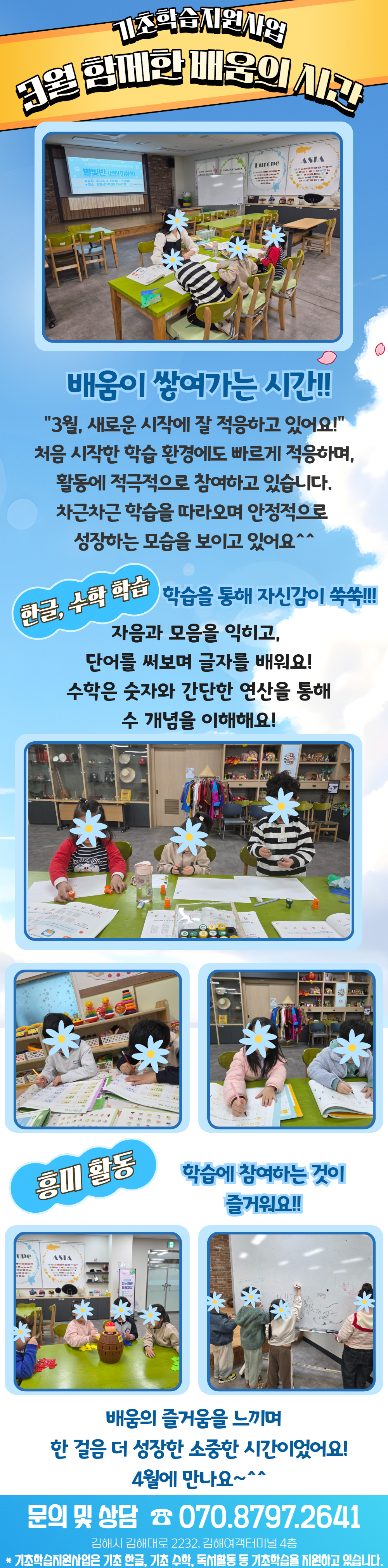 우리 친구들이 3월 새롭게 수업에 참여하며 낯선 공간에서 조금 긴장하기도 했지만