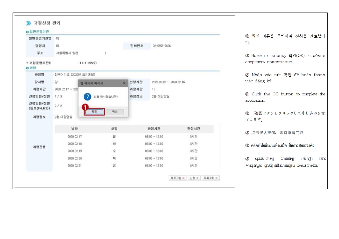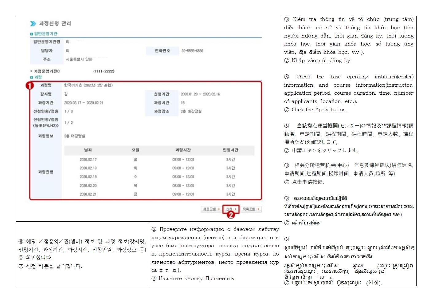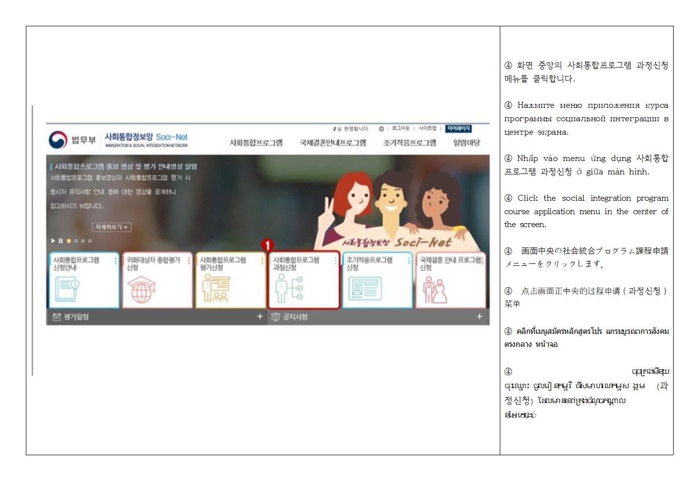 *사회통합프로그램 과정 신청 → 센터명, 수업 요일, 시간, 장소, 단계 확인 후 원하는 기관 클릭 → 신청