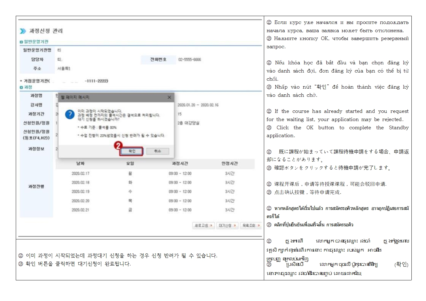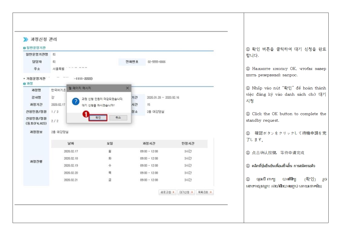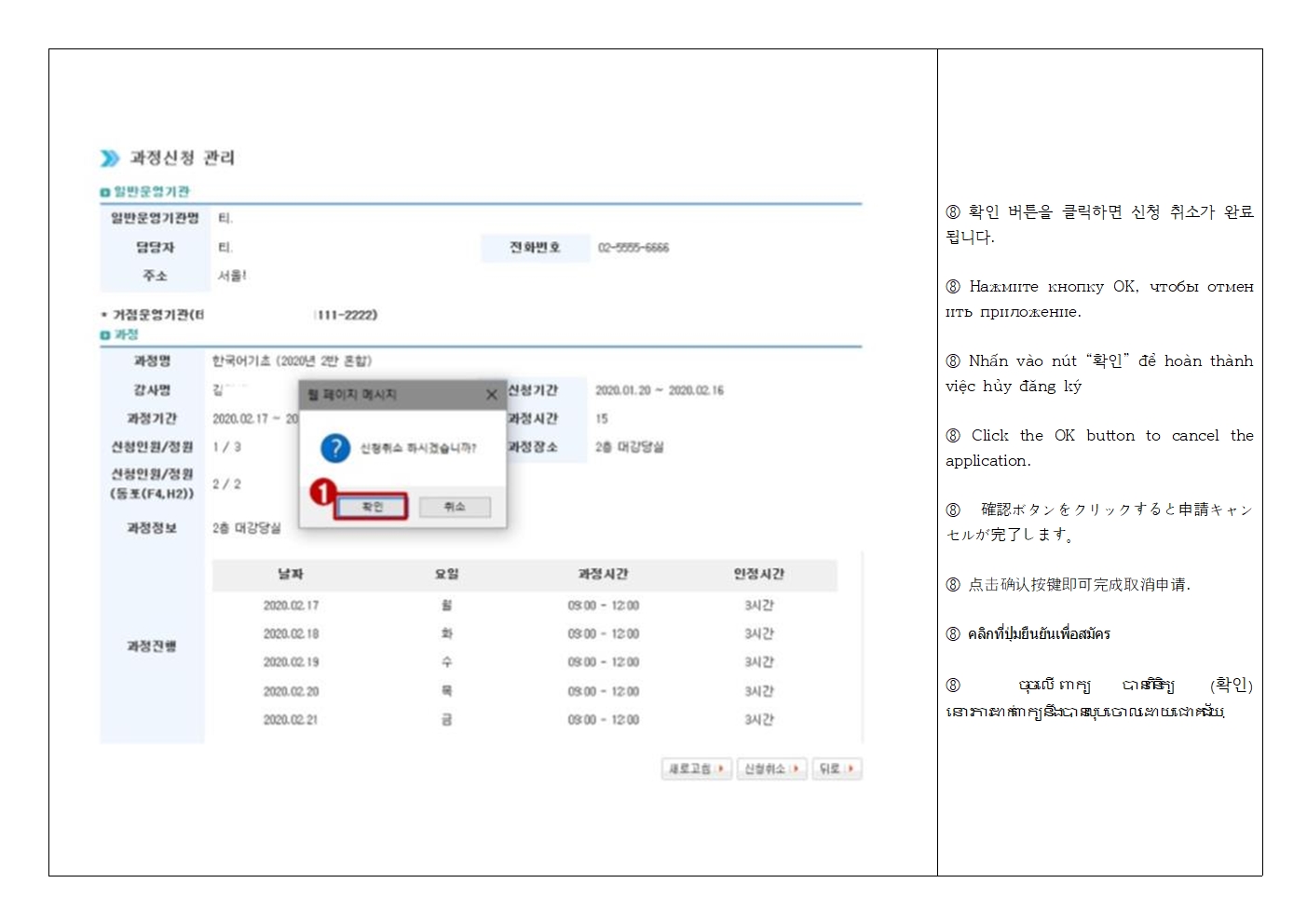 *사회통합프로그램 과정 신청 → 센터명, 수업 요일, 시간, 장소, 단계 확인 후 원하는 기관 클릭 → 신청