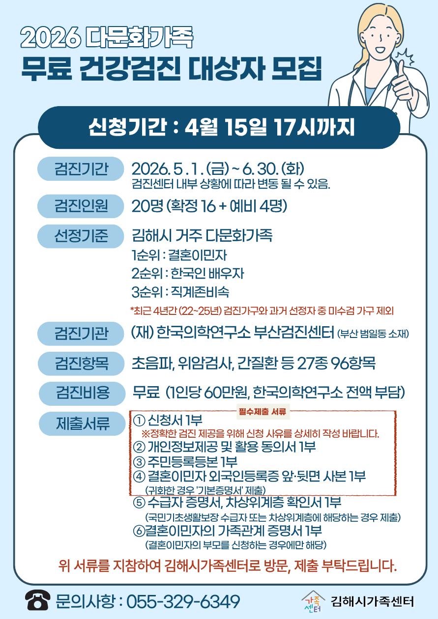 2026년 다문화가족 무료건강검진 대상자 모집 안내 작성자김해다문화|작성시간26.04.03|조회수20 목록 댓글 0 글자크기 작게가 글자크기 크게가 2026년 경상남도 다문화가족 무료 건강검진 신청서.hwp113.50KB 첨부파일첨부된 파일이 2개 있습니다. png 파일 2026 다문화가족 무료 건강검진 홍보지.png 다운로드 hwp 파일 2026년 경상남도 다문화가족 무료 건강검진 신청서.hwp 다운로드 다음검색 현재 게시글 추가 기능 열기 북마크 신고 센터로 신고 댓글 댓글 0 댓글쓰기 답글쓰기 댓글 리스트