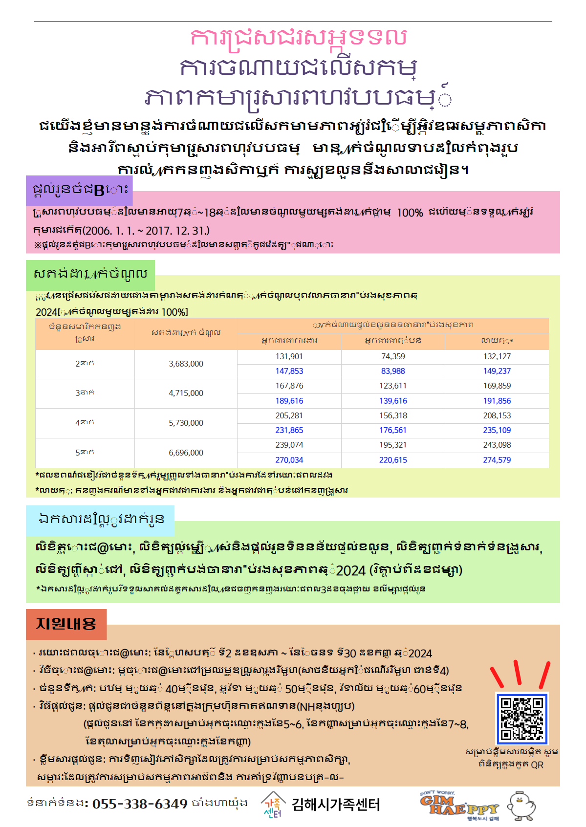 A. 한국 국적을 가진 7세~18세(2006. 1. 1. ~ 2017. 12. 31.) 자녀만 해당되며 교육 급여를 받지 않는 중위소득 100% 이하만 신청 가능합니다.
