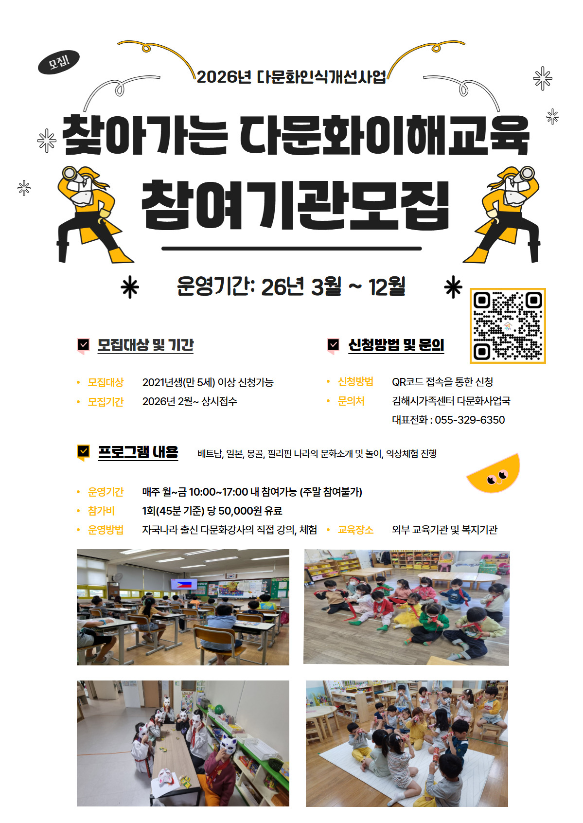 2026년 찾아가는 다문화이해교육 참여기관 모집안내 작성자김해다문화|작성시간26.01.30|조회수35 목록 댓글 0 글자크기 작게가 글자크기 크게가 다음검색 현재 게시글 추가 기능 열기 북마크 공유하기 신고 센터로 신고 댓글 댓글 0 댓글쓰기 답글쓰기 댓글 리스트