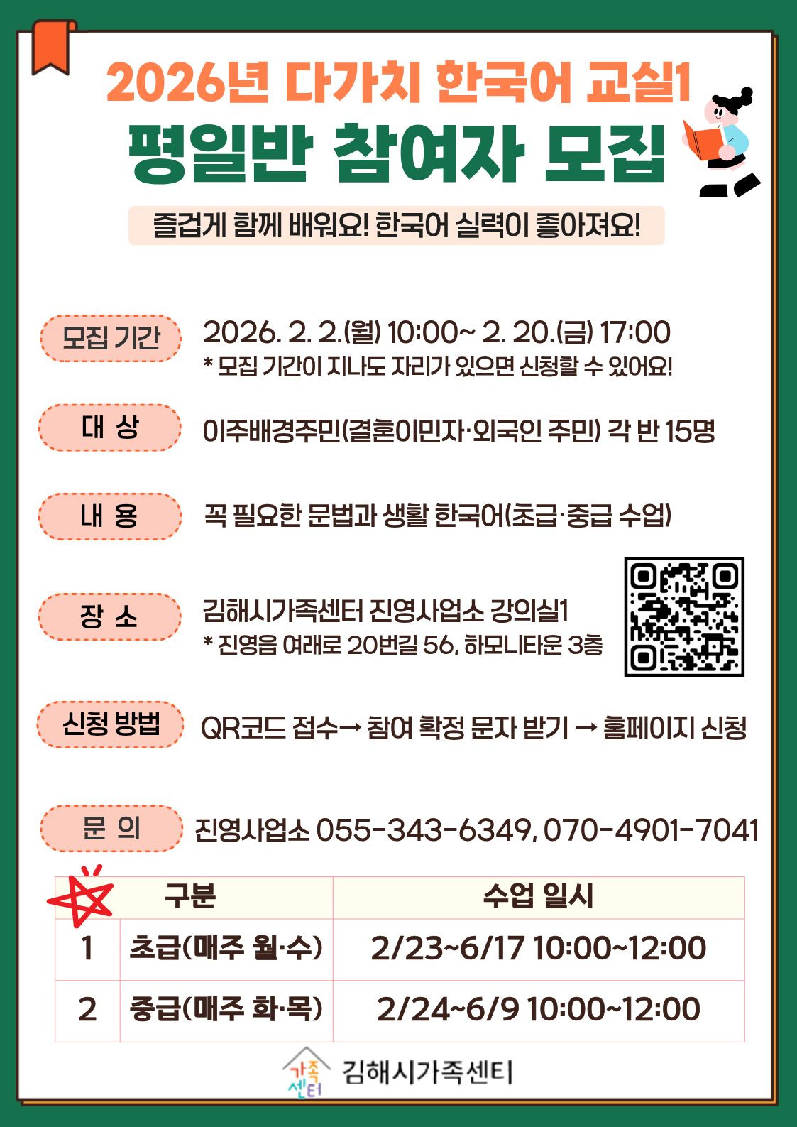 [진영] 다가치 한국어 교실1(평일반) 참여자 모집 작성자김해다문화|작성시간26.02.02|조회수22 목록 댓글 0 글자크기 작게가 글자크기 크게가 *신청하기: https://forms.gle/1rJtwR14h5LTUT3q9 다음검색 현재 게시글 추가 기능 열기 북마크 공유하기 신고 센터로 신고 댓글 댓글 0 댓글쓰기 답글쓰기 댓글 리스트