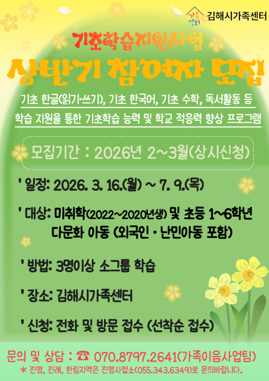 [모집] 2026년 기초학습지원사업 상반기 참여자 모집 안내 작성자김해다문화|작성시간26.02.02|조회수49 목록 댓글 0 글자크기 작게가 글자크기 크게가 2026년 기초학습지원사업 상반기 참여자를 모집합니다.문의 : ☎ 070. 8797. 2641(가족이음사업팀)(베트남어) 2026 기초학습지원사업 홍보지.hwp88.50KB(일본어) 2026 기초학습지원사업 홍보지.hwp84.50KB(중국어)2026 기초학습지원사업 홍보지.hwp69.50KB(러시아어)2026 기초학습지원사업 홍보지.hwp86.50KB 첨부파일첨부된 파일이 5개 있습니다. png 파일 2026년 기초학습지원사업 홍보지.png 다운로드 hwp 파일 (일본어) 2026 기초학습지원사업 홍보지.hwp 다운로드 hwp 파일 (베트남어) 2026 기초학습지원사업 홍보지.hwp 다운로드 hwp 파일 (중국어)2026 기초학습지원사업 홍보지.hwp 다운로드 hwp 파일 (러시아어)2026 기초학습지원사업 홍보지.hwp 다운로드 다음검색 현재 게시글 추가 기능 열기 북마크 공유하기 신고 센터로 신고 댓글 댓글 0 댓글쓰기 답글쓰기 댓글 리스트