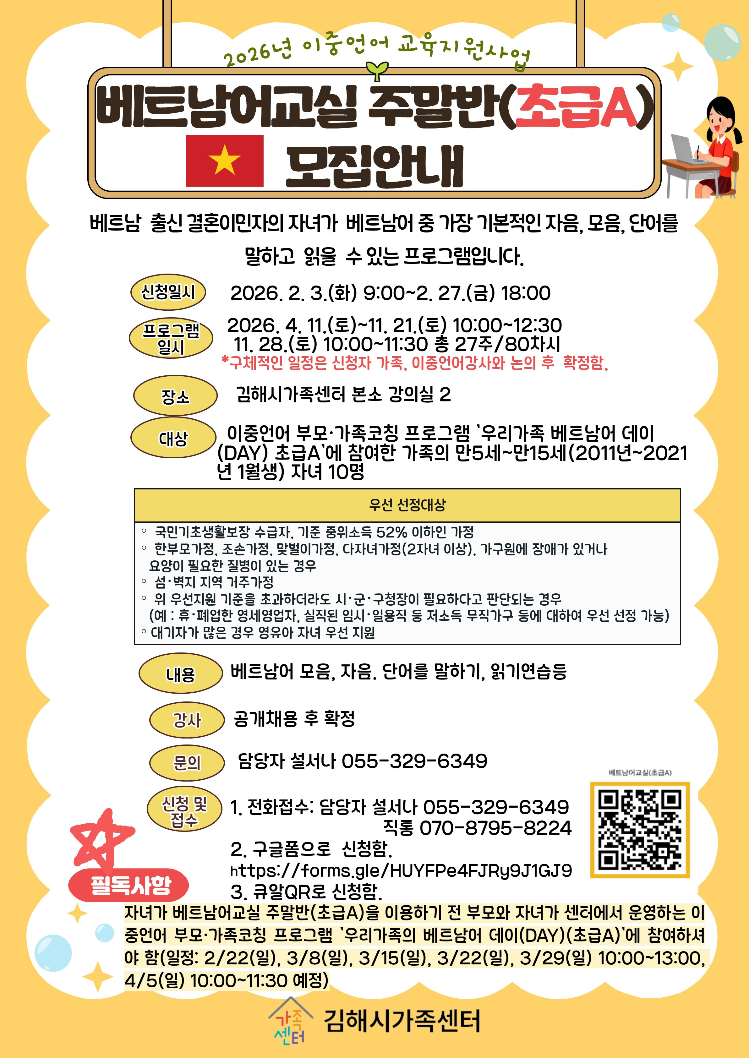 ◆ 기타: 자녀가 베트남어교실(중급반) 주말반을 이용하기 전 부모와 자녀가 필수 22차시의 이중언어 부모가족코칭 프로그램에 참여해야 함. *일정: 2월 22일(일), 3월 8일(일), 3월 15일(일), 3월 22일(일), 3월 29일(일) 10:00~13:00, 4월 5일(일) 10:00~11:30(예정)
