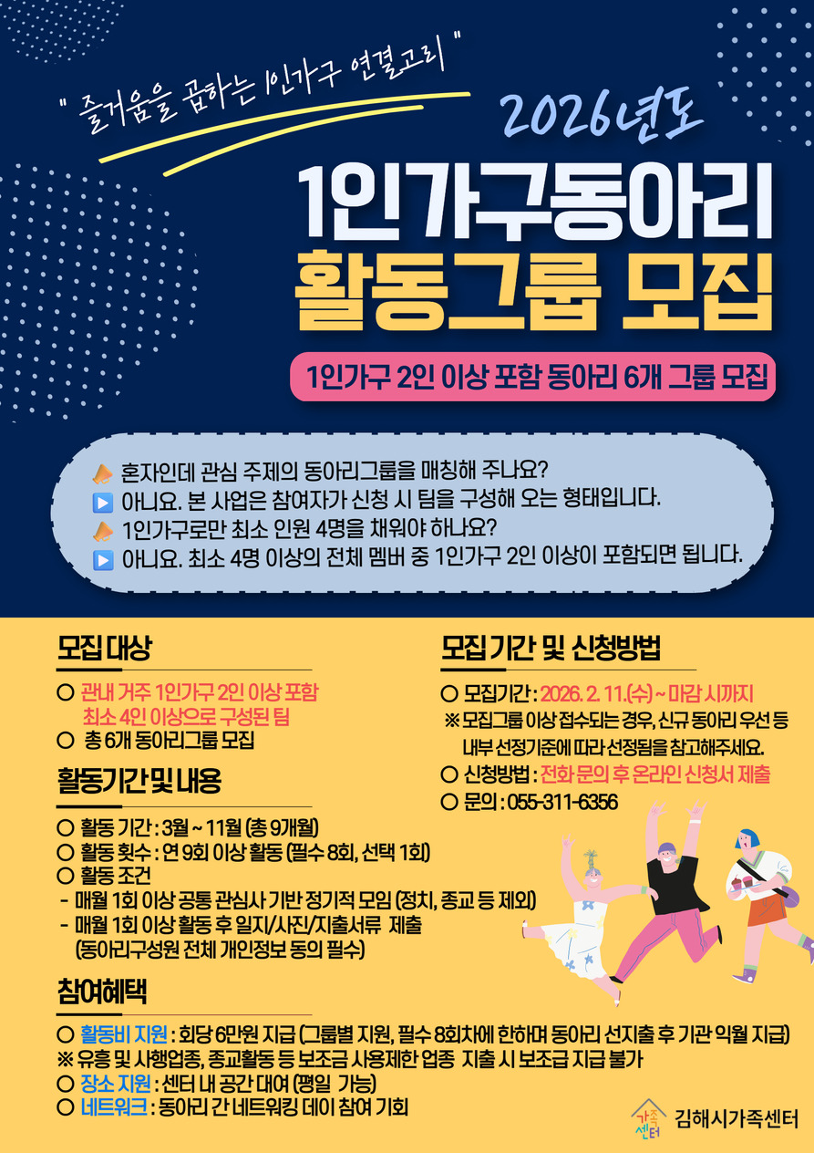 올해 가족센터와 함께할 1인가구 동아리를 모집합니다.
