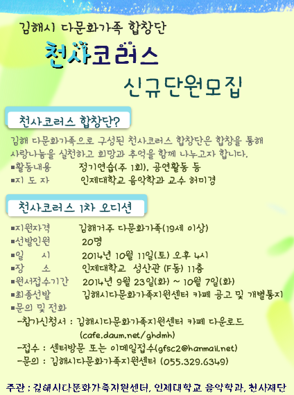 김해시다문화가족 합창단 『천사코러스』신규단원 모집 작성자김해다문화|작성시간14.09.25|조회수241 목록 댓글 0 글자크기 작게가 글자크기 크게가 천사코러스합창단-참가신청서.hwp 첨부파일첨부된 파일이 2개 있습니다. etc 파일 천사코러스 홍보지.PNG 다운로드 hwp 파일 천사코러스합창단-참가신청서.hwp 다운로드 다음검색 현재 게시글 추가 기능 열기 북마크 공유하기 신고 센터로 신고 댓글 댓글 0 댓글쓰기 답글쓰기 댓글 리스트