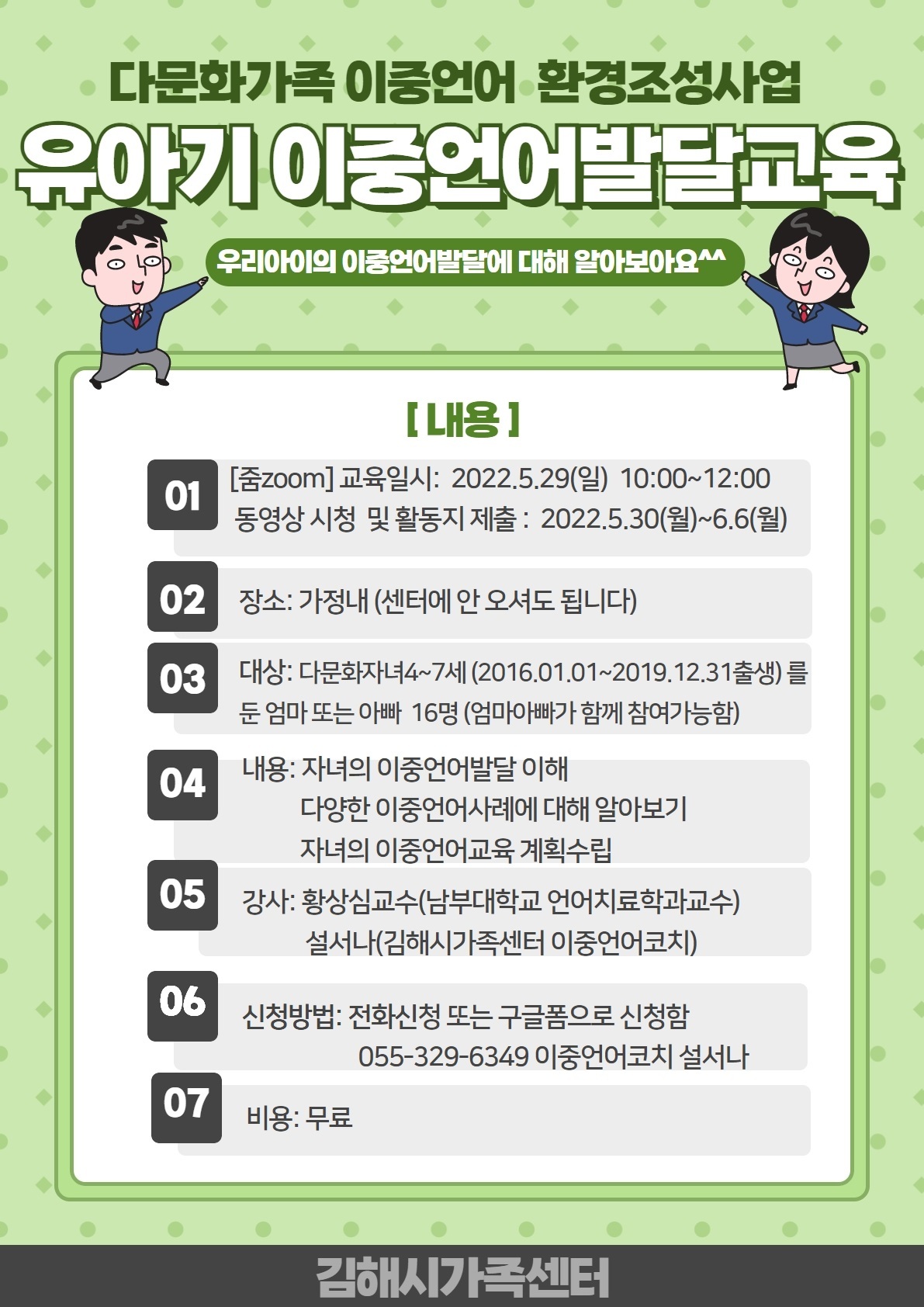 Xin chào. Tôi là Seol-So-Na, người phụ trách dự án song ngữ tại Trung tâm Gia đình Gimhae. Trung tâm có kế hoạch cho chương trình đào tạo cho phụ huynh về “Giáo dục phát triển song ngữ cho trẻ em” , thuộc dự án tạo môi trường song ngữ trong gia đình. Chương trình được lên kế hoạch với tổng là 3 buổi đào tạo.