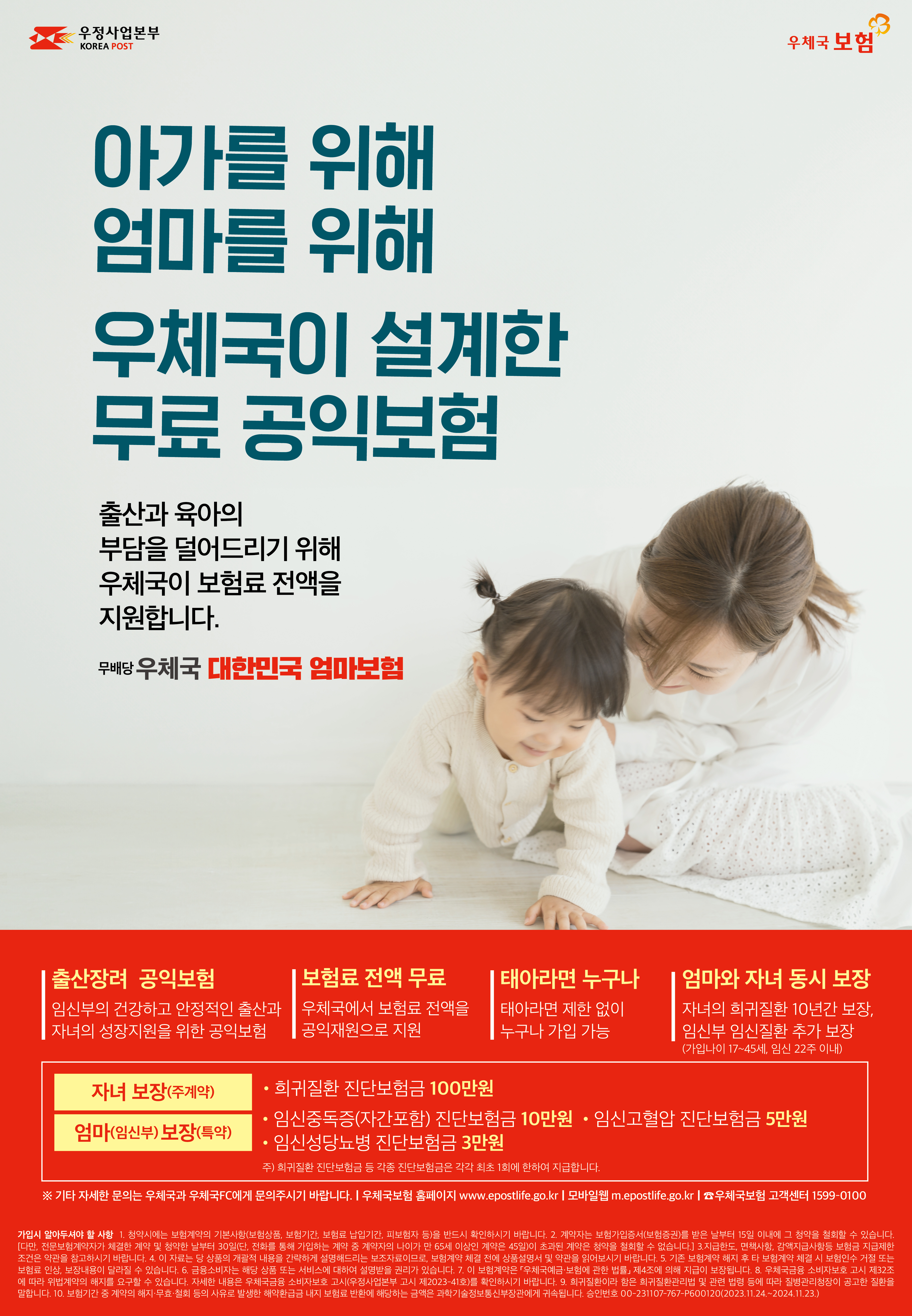 무료로 보장하는 공익보험‘우체국 대한민국 엄마보험'을 출시하였습니다.