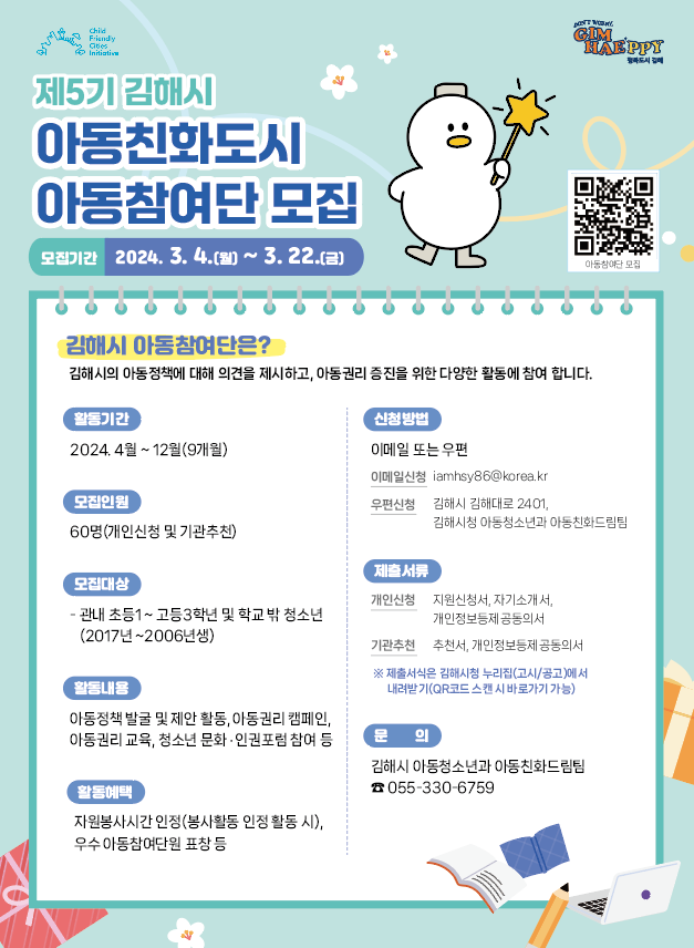 아동친화도시 아동참여단 모집 작성자김해다문화|작성시간24.03.19|조회수68 목록 댓글 0 글자크기 작게가 글자크기 크게가 ★ 문의 : 김해시 아동청소년과 아동친화드림팀 ☎ 055-330-6759 다음검색 현재 게시글 추가 기능 열기 북마크 공유하기 신고 센터로 신고 댓글 댓글 0 댓글쓰기 답글쓰기 댓글 리스트