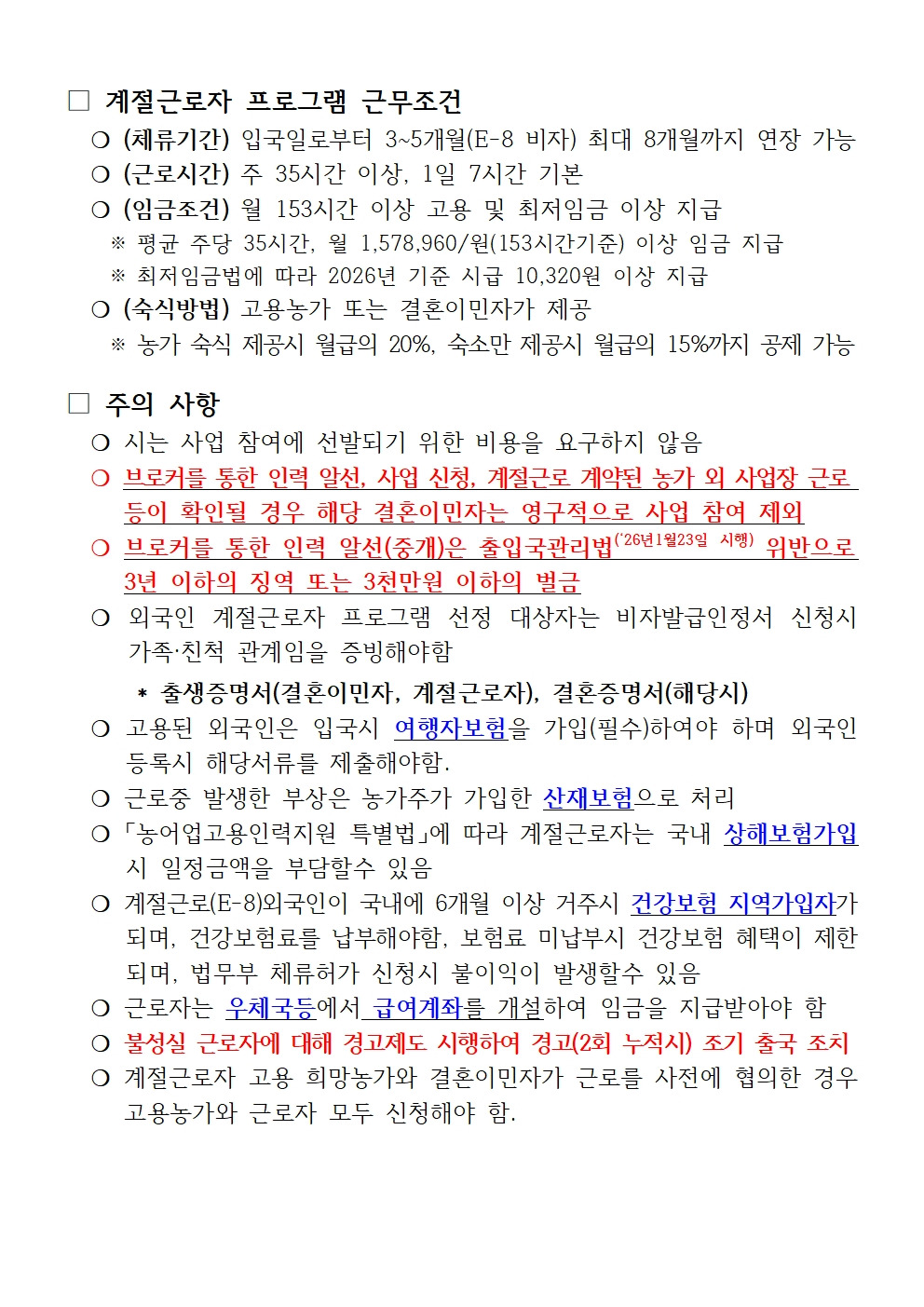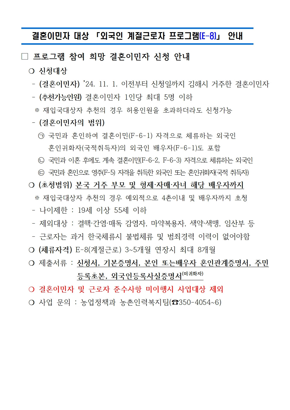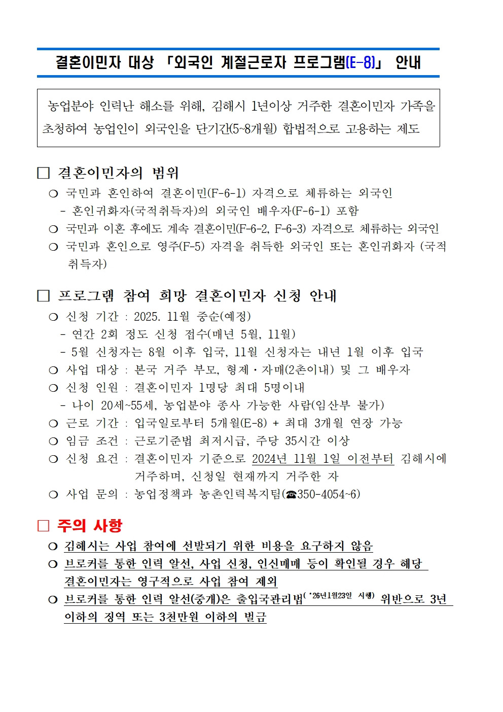 결혼이민자 대상 「외국인 계절근로자 프로그램(E-8)」 안내