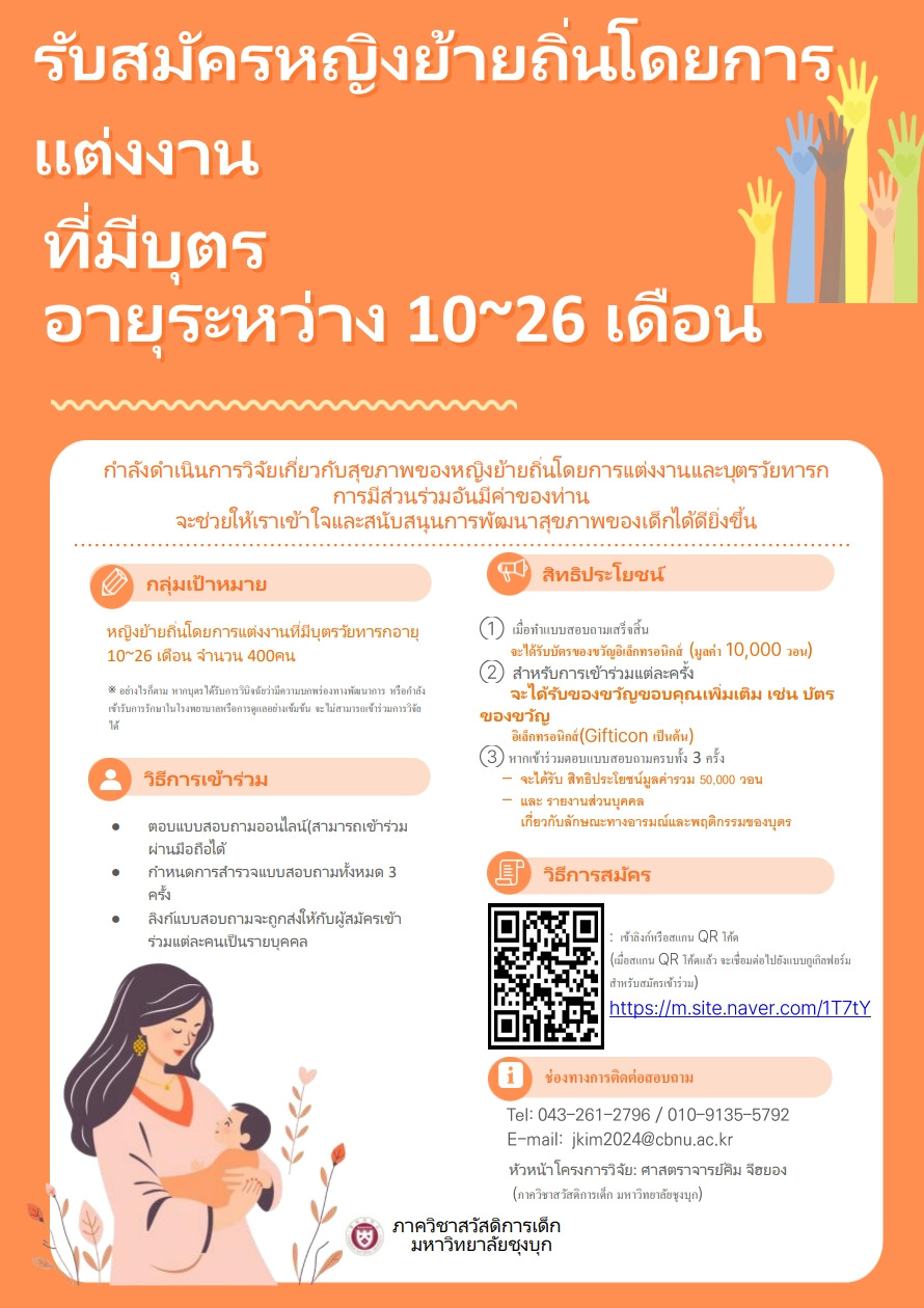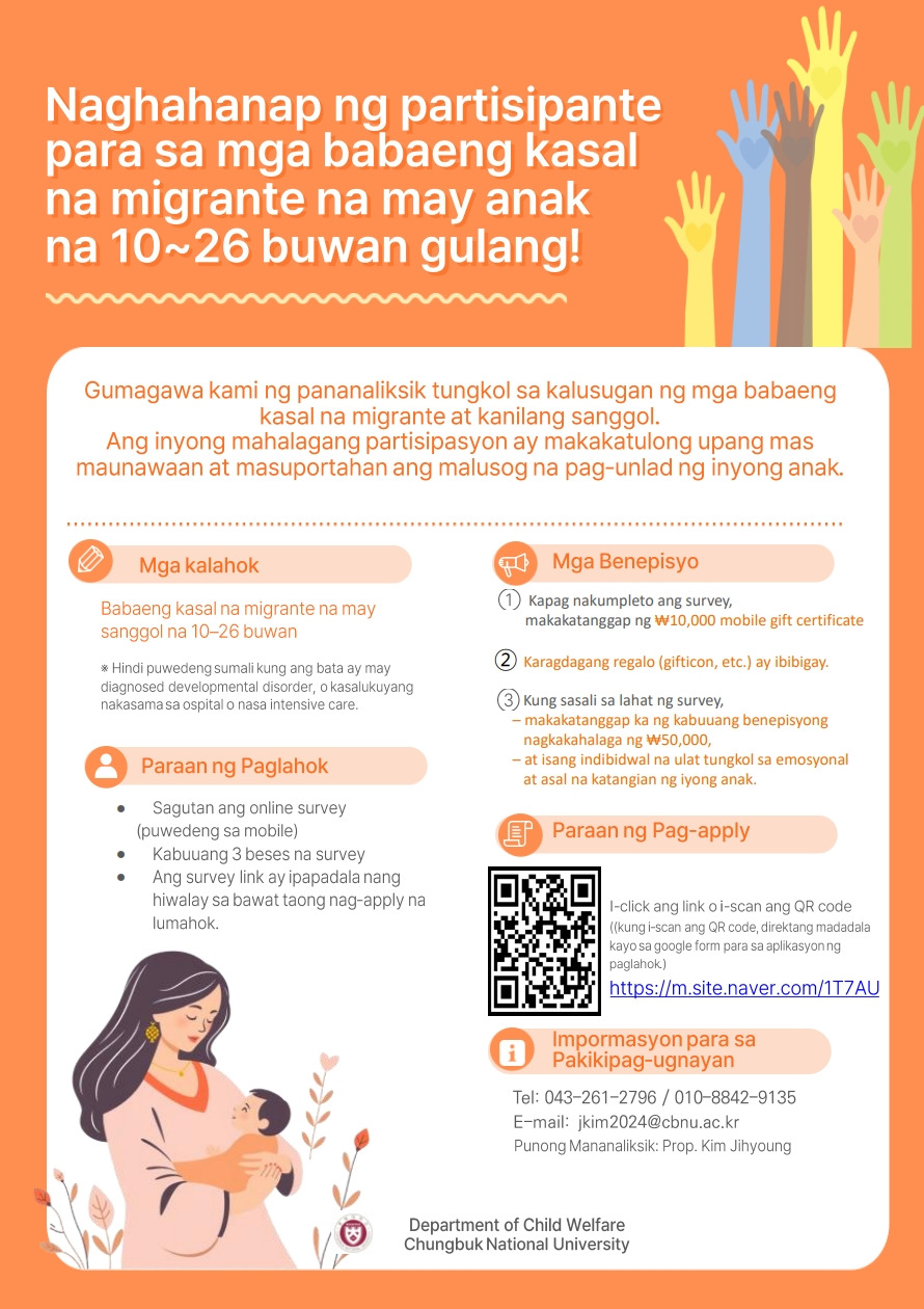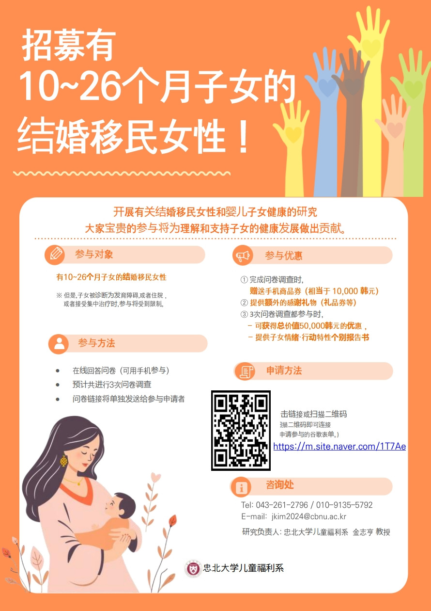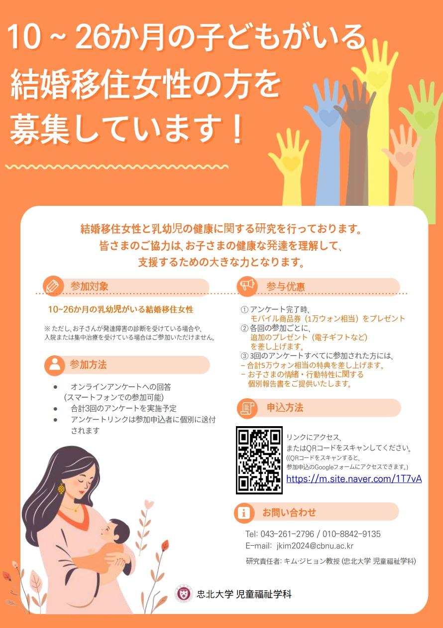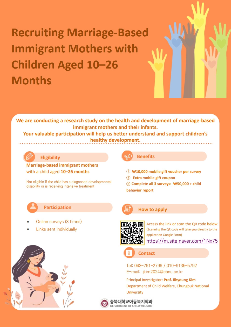 충북대학교 아동복지학과(책임연구자 김지형 교수)는 교육부·한국연구재단 지원 과제 로 결혼이주여성과 영아의 건강 및 발달에 관한 연구를 수행 중이며, 연구 결과를 토대로 다문화가정 지원 정책 수립을 위한 기초자료를 제공하고자 합니다. 이에 다음과 같이 연구 참여대상자를 모집하고자 합니다.